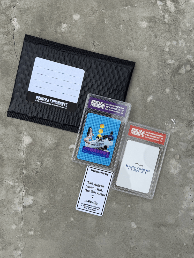 Remixed Fragments Collector Cards are from my street archive, numbered, and stamped. Each card is a small, pocket-sized fragment of everyday life, remixed and released in limited editions.